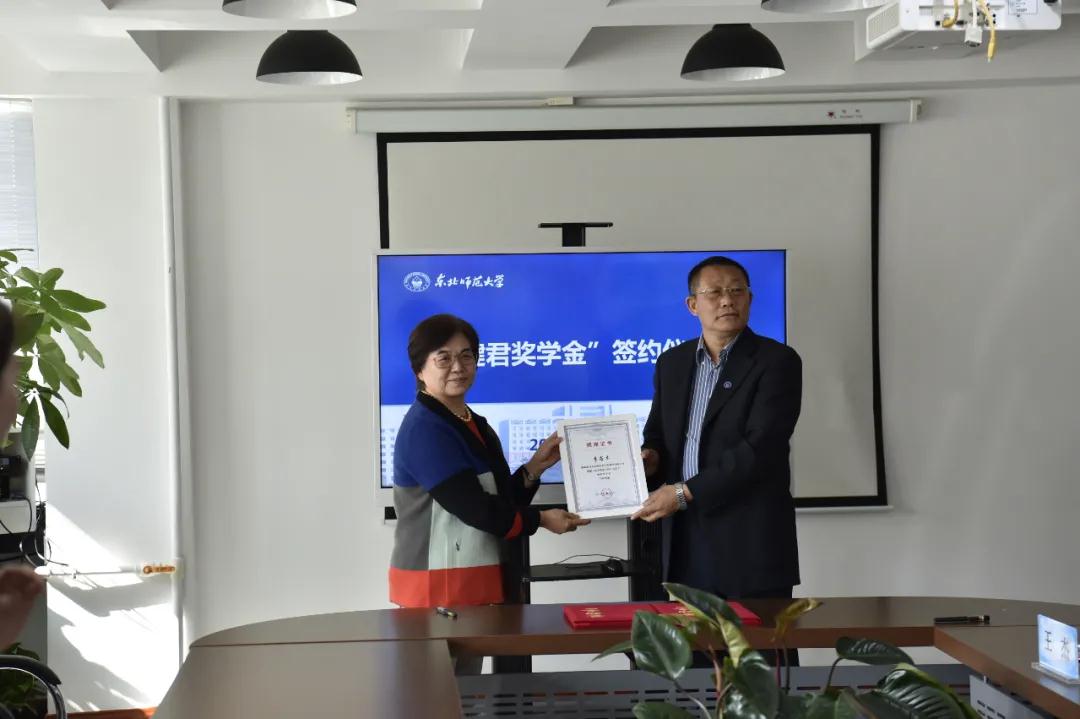 在签约仪式上,王延代表学校致辞。他说,“健君奖学金”是一项有情义、有创意、有意义的捐赠项目。解玲、周桂君分别介绍了相关学科建设及学生培养情况,对校友及出资人表达了诚挚的感谢。王延颁发捐赠证书并接受了校友赠书。这项奖学金的设立,不仅体现了李健君、常桂芝校友对学校以及学院的深情厚谊,也体现了东师文化的一脉相承,东师精神的薪火相传。