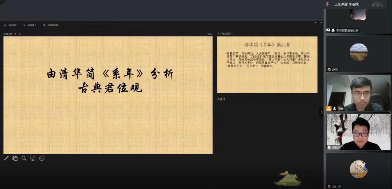 本次讲座,李若晖先生以清华简《系年》第九章关于晋灵公继位的合法性为切入点,梳理相关文献,细密地分析了春秋至汉代的君位与君责,尤其讨论到国君的职分问题等。李若晖先生的分析越出以往单纯的史实考证,别开生面,对在线收听的师生有很大的启发。