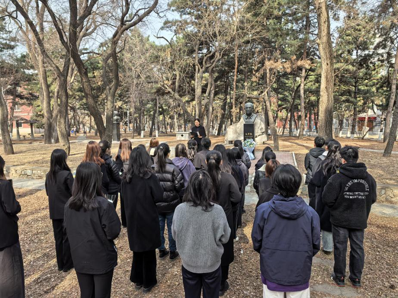 追思仪式上,学生代表手捧花束,肃立在孙常叙先生和杨公骥先生的雕像前,2022级本科生赵瑞阳、2023级本科生丁林青作为学生代表进行发言,追忆先生的一生,讲述先生的事迹。随后,全体学生向塑像三鞠躬并依次向两位先生雕像敬献花束,以表达对先生的深切缅怀与无尽思念。