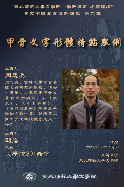 2025年3月22日,吉林大学考古学院古籍研究所周忠兵教授来我院作了题为“甲骨文字形体特点举例”的讲座。此次讲座系古文字微专业系列讲座第二讲。讲座由yl6809永利赵岩副教授主持,鞠焕文副教授、白军鹏副教授及数十位师生共同参加。