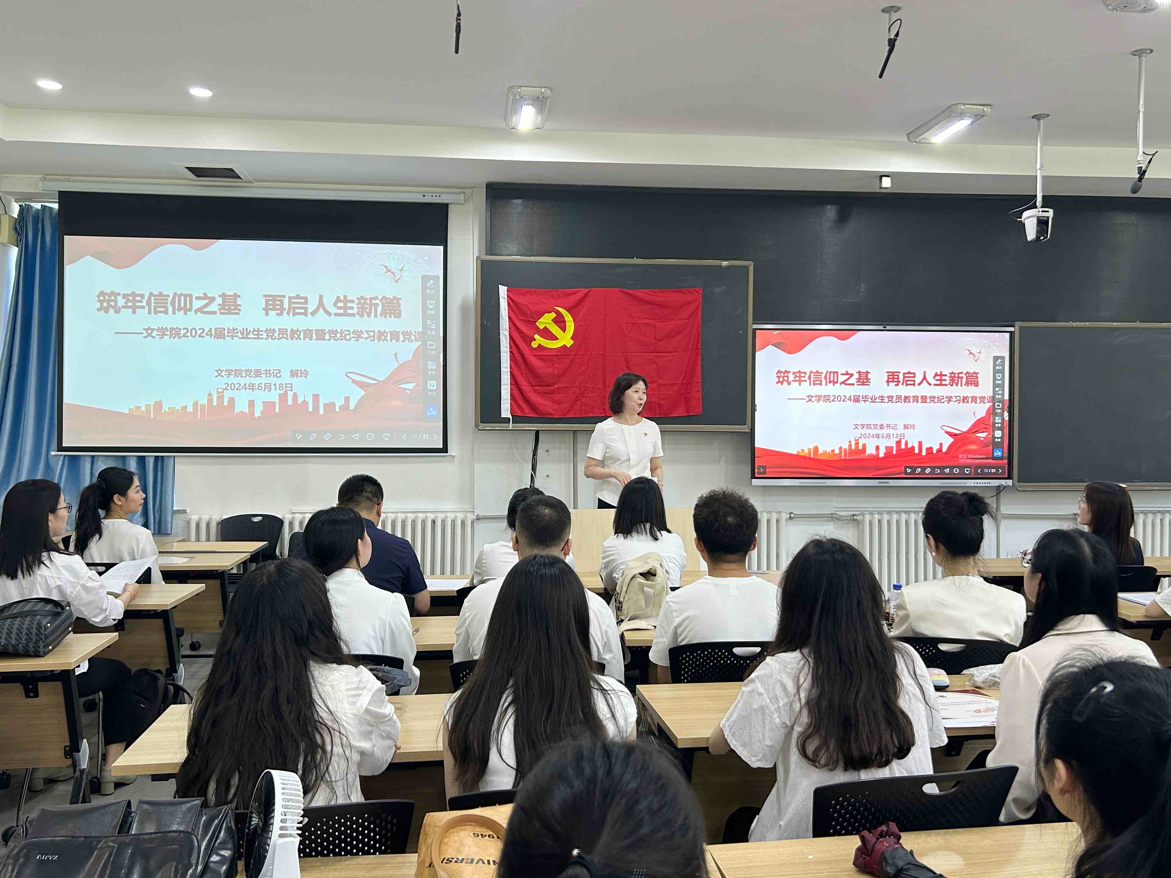 随后,解玲书记以“筑牢信仰之基 再启人生新篇”为主题,为全体党员讲授党纪学习教育专题党课。她全面梳理了党的纪律建设的历史进程,以鲜活的案例生动地讲述了党规党纪面前没有法外之人,并叮嘱毕业生党员筑牢思想防线,做到防微杜渐,同时寄语大家在新的岗位上奋发有为,谱写新篇。