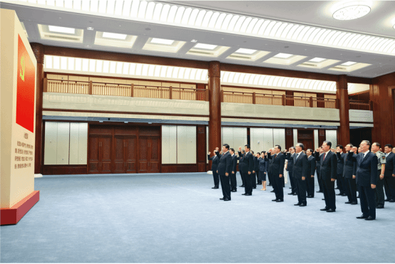 2021年6月18日,党和国家领导人习近平、李克强、栗战书、汪洋、王沪宁、赵乐际、韩正、王岐山等在中国共产党历史展览馆参观“‘不忘初心、牢记使命’中国共产党历史展览”。这是参观结束后,习近平带领党员领导同志一起重温入党誓词。 新华社记者 鞠鹏/摄