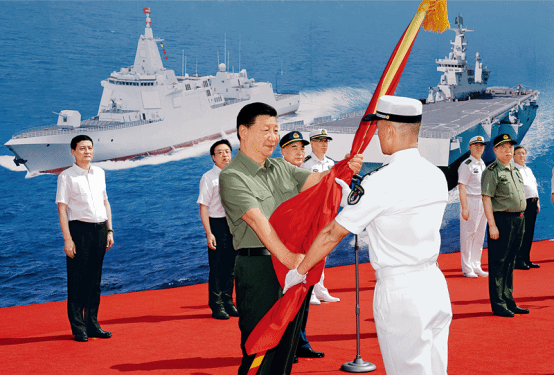2021年4月23日,海军三型主战舰艇——长征18号艇、大连舰、海南舰在海南三亚某军港集中交接入列。中共中央总书记、国家主席、中央军委主席习近平出席交接入列活动并登上舰艇视察。这是习近平向长征18号艇授予军旗、命名证书。 新华社记者 李刚/摄