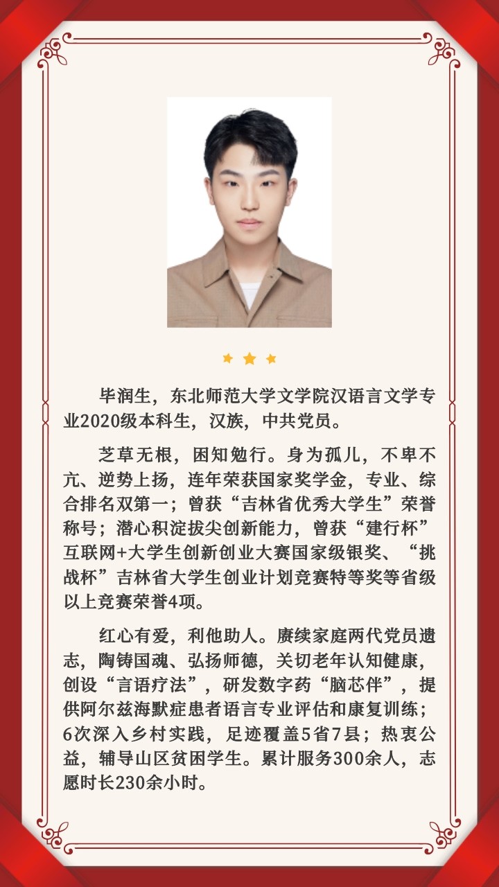 毕润生,我院2020级汉语言文学专业学生,中共党员。曾获“吉林省优秀大学生”荣誉称号,获“建行杯”互联网+大学生创新创业大赛国家级银奖、“挑战杯”吉林省大学生创业计划竞赛特等奖等省级以上竞赛荣誉4项。创设“言语疗法”,研发数字药“脑芯伴”,为阿尔兹海默症患者提供语言专业评估和康复训练;6次深入乡村实践,足迹覆盖5个省份7个县(市、区)。